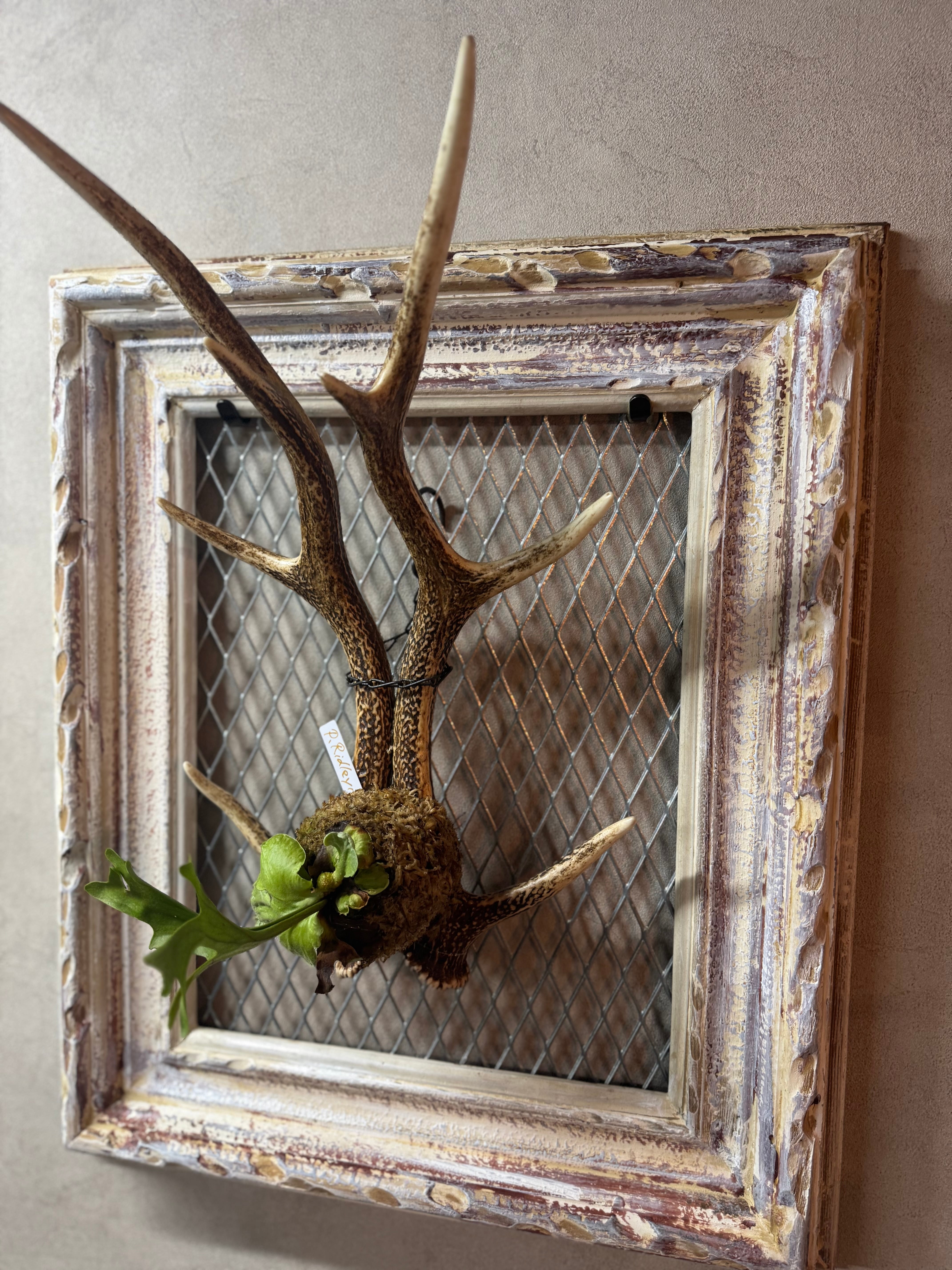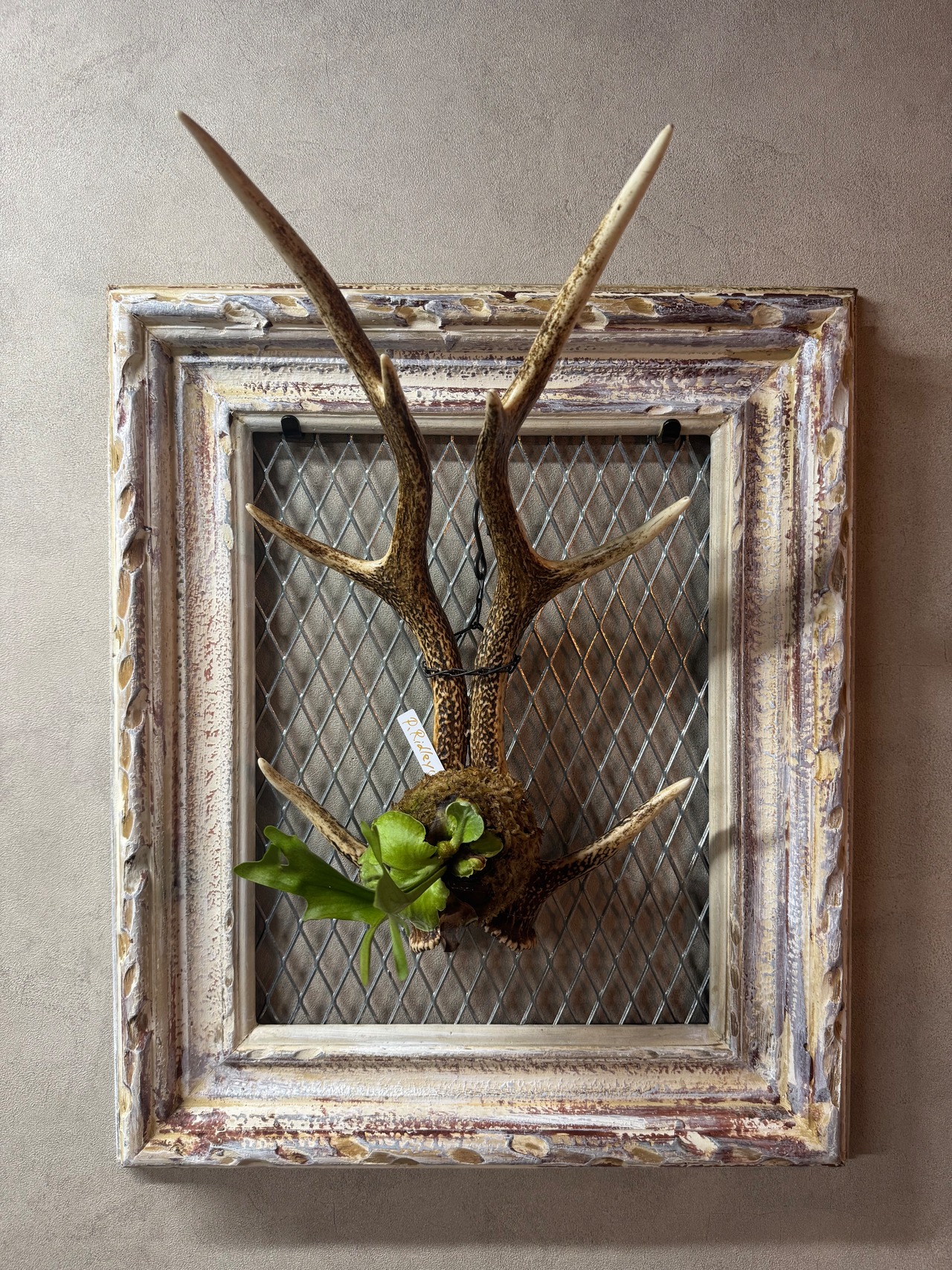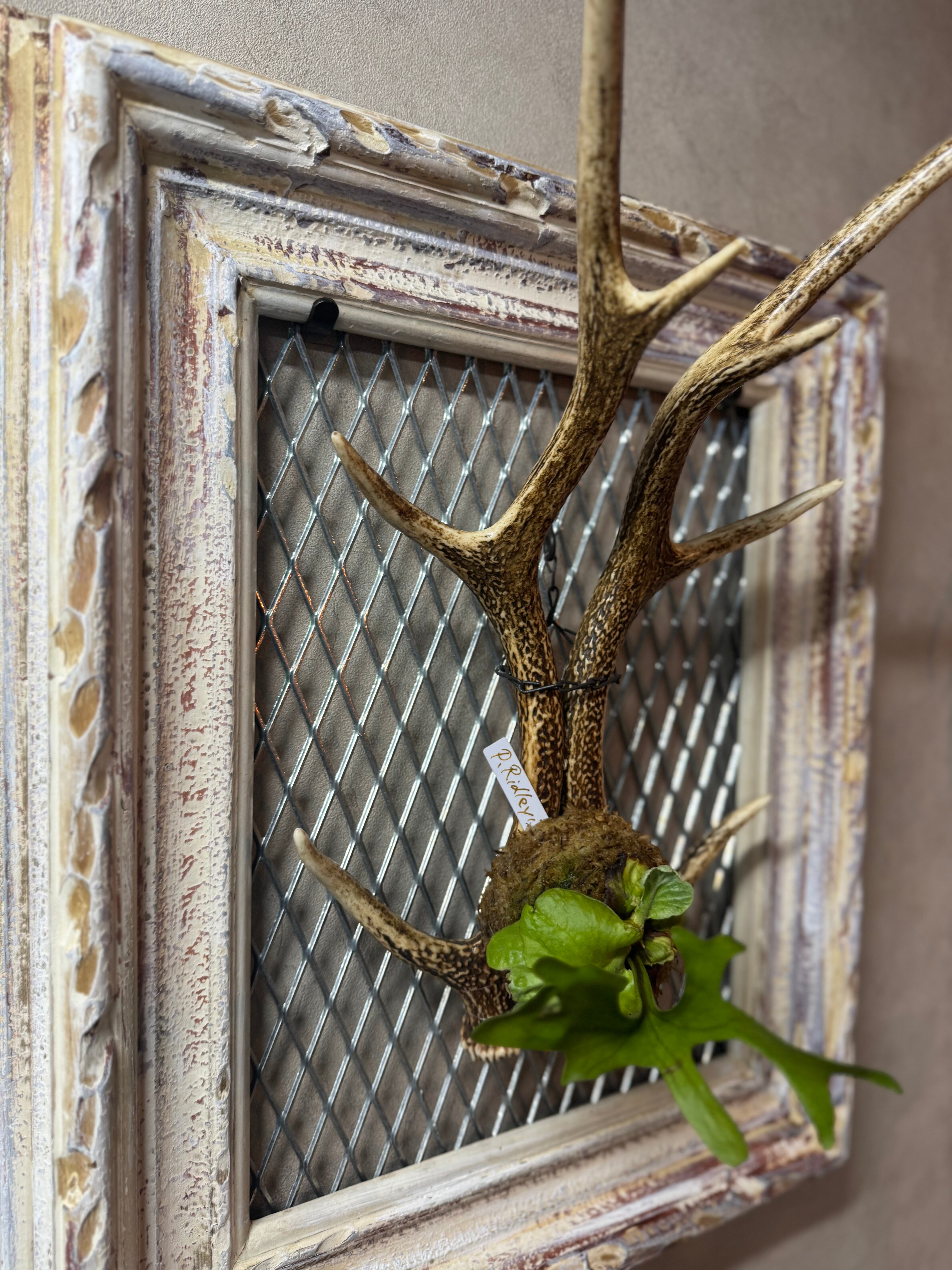アンティークフレームと、鹿の角を使った壁掛けのビカクシダのディスプレイフレームです。